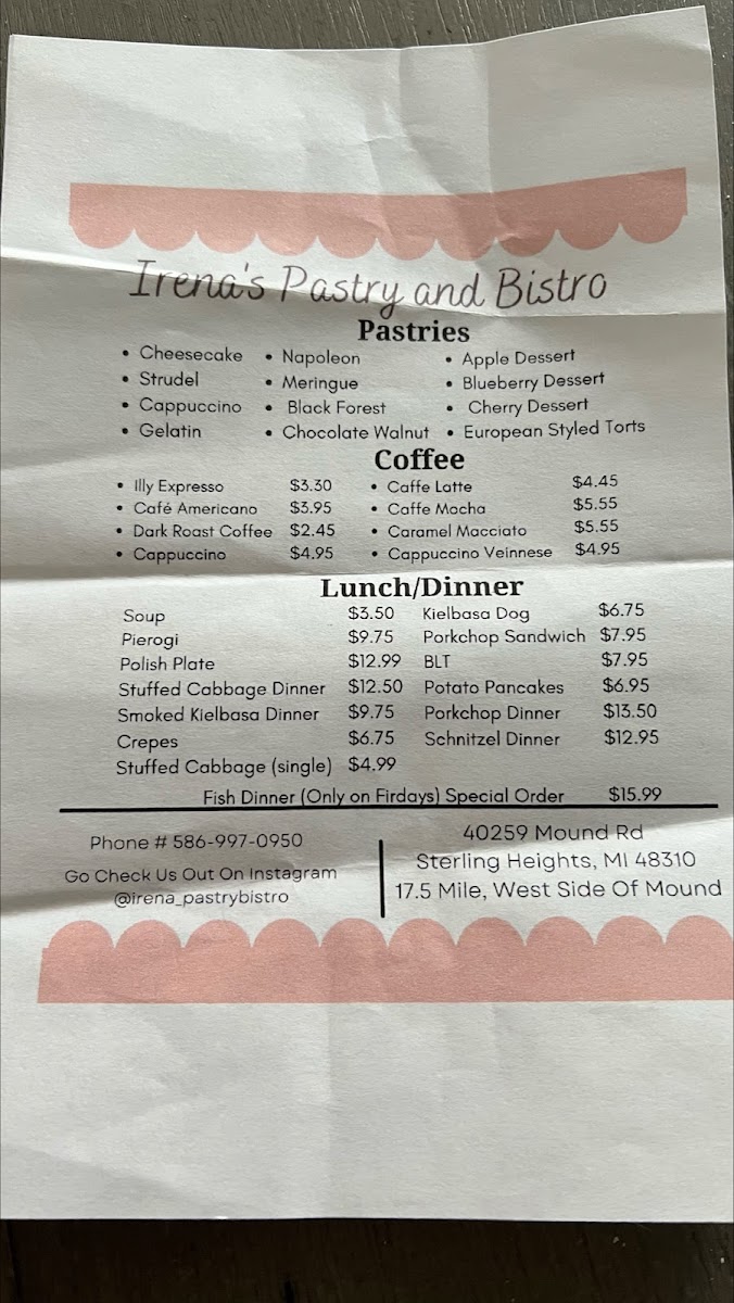 Overall, Irena's Pastry & Bistro provides a menu that truly reflects the rich culinary traditions of Poland. With a variety of soups, appetizers, and hearty main courses, there’s something for everyone, whether you're craving something light and comforting or a full, satisfying meal. Every dish feels like a warm hug from Poland, making it a fantastic destination for those seeking authentic Polish flavors in a cozy and inviting setting.